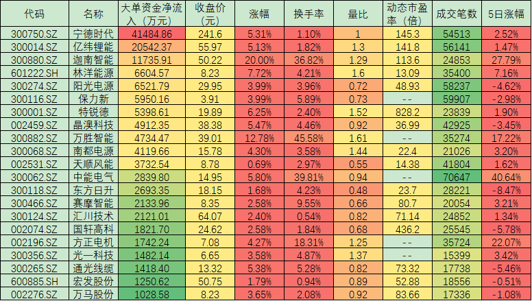 正如分析人士所言,景氣度和業(yè)績帶來了投資熱度和市場風(fēng)口,同時(shí),市場資金也開始積極布局,其中,寧德時(shí)代(41484.86萬元)、億緯鋰能(20542.37萬元)、迦南智能(11735.91萬元)等3只個(gè)股大單凈流入均超1億元,另有包括林洋能源、陽光電源、保力新等在內(nèi)的18只個(gè)股大單凈流入額均超1000萬元,以上21只個(gè)股合計(jì)大單凈流入13.43億元。