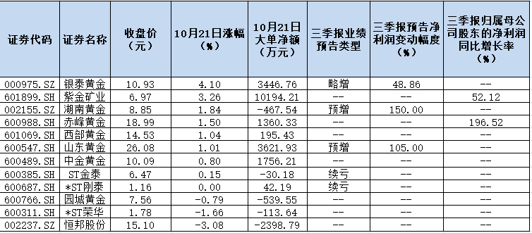 股價(jià)上漲的背后離不開“真金白銀”的助推,《證券日?qǐng)?bào)》記者根據(jù)同花順數(shù)據(jù)統(tǒng)計(jì)發(fā)現(xiàn),10月21日,共有7只黃金股成為大單資金搶籌的重點(diǎn),合計(jì)大單資金凈流入2.06億元,其中,紫金礦業(yè)大單資金凈流入超億元,達(dá)到1.02億元,山東黃金、銀泰黃金、中金黃金、赤峰黃金等4只個(gè)股大單資金凈流入也均在1000萬元以上,分別為3621.93萬元、3446.76萬元、1756.21萬元、1360.33萬元。