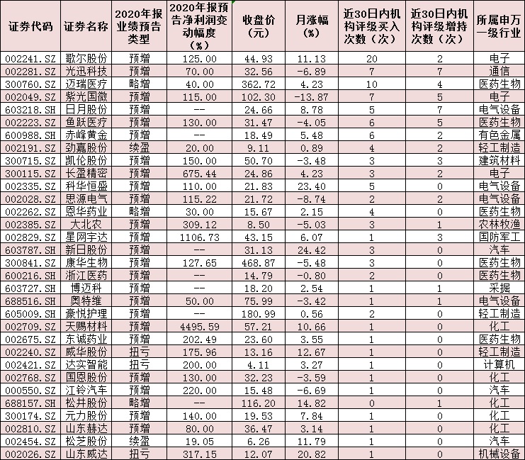 表:機構近30日內(nèi)給予“買入”或“增持”以上評級的年報預喜公司情況: