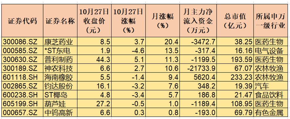 從近期市場行情表現(xiàn)來看,截至10月27日收盤,上證指數(shù)10月份以來累計漲幅為1.13%,海南板塊內(nèi)有7只個股跑贏大盤,分別為康芝藥業(yè)、*ST東電、普利制藥、神農(nóng)科技、海南橡膠、鈞達股份。其中,康芝藥業(yè)表現(xiàn)最為出色,本月初至今漲幅達20.40%。