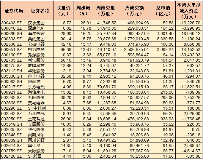 表:11月2日-11月6日家用電器行業(yè)周漲幅超5%個(gè)股一覽
