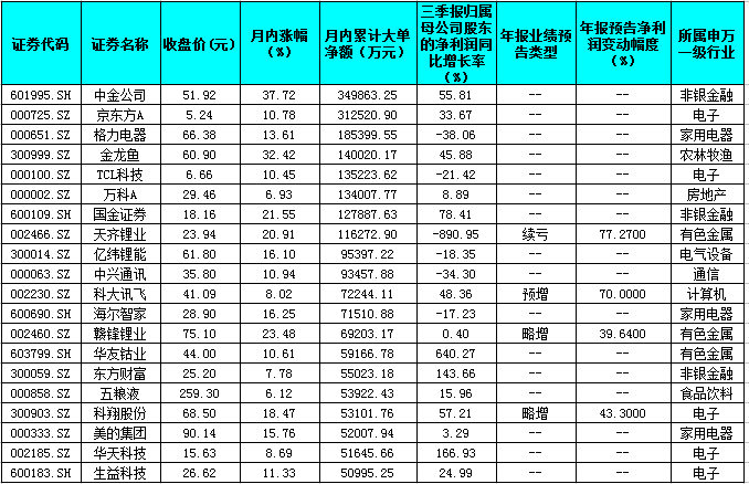 表:月內(nèi)大單資金凈流入在5億元以上個(gè)股一覽