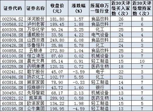 與此同時(shí),出色的表現(xiàn)也受到機(jī)構(gòu)的高度關(guān)注。統(tǒng)計(jì)顯示,在上述66只強(qiáng)勢股中,機(jī)構(gòu)近30日內(nèi)給予“買入”或“增持”以上評級的公司達(dá)61家,占比逾九成,其中,推薦次數(shù)超過10次的公司達(dá)41家。