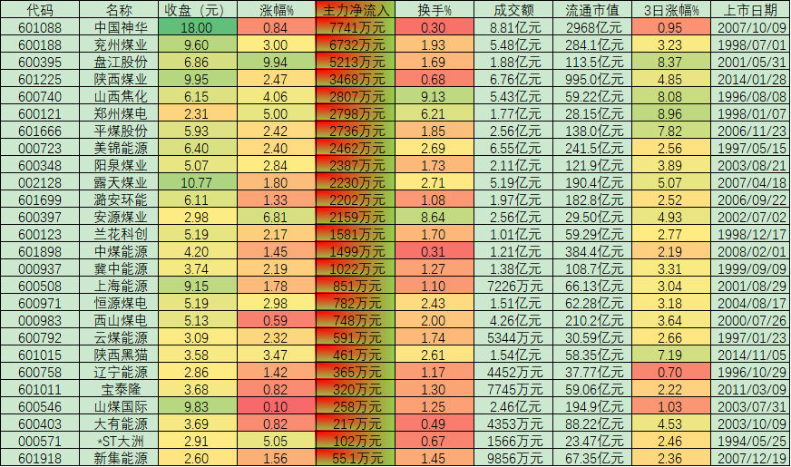 表:周三呈大單凈流入煤炭采選股市場表現(xiàn)一覽