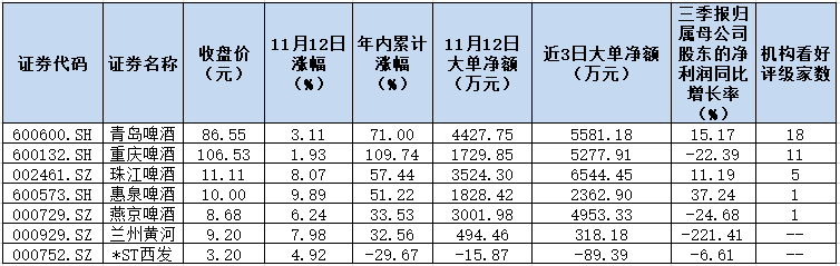 可以看到,A股在大漲后出現(xiàn)短期正常休整,同時(shí)主力資金進(jìn)入結(jié)構(gòu)性調(diào)倉階段,市場分化現(xiàn)象較為明顯,板塊間的輪動以及風(fēng)格的切換較為頻繁。在這期間啤酒股吸金能力不容小覷?!蹲C券日報(bào)》記者根據(jù)同花順數(shù)據(jù)統(tǒng)計(jì)發(fā)現(xiàn),近3個(gè)交易日,6只啤酒股呈現(xiàn)大單資金凈流入態(tài)勢,占行業(yè)內(nèi)成份股家數(shù)比例為85.71%,重慶啤酒、青島啤酒、珠江啤酒等個(gè)股期間累計(jì)漲幅均在5000萬元以上。僅從11月12日來看,青島啤酒、珠江啤酒、燕京啤酒等3只個(gè)股大單資金凈流入均超3000萬元,合計(jì)吸金1.1億元。