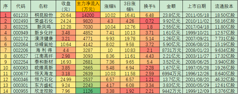 周一化纖板塊的強勢表現(xiàn)與大單資金搶籌關系密切。據(jù)《證券日報》記者統(tǒng)計顯示,周一,化纖板塊整體資金凈流入合計6.36億元,其中,有包括桐昆股份(1.42億元)、榮盛石化(9820萬元)、新鳳鳴(7030萬元)在內(nèi)的14只個股凈流入均超1000萬元,合計流入6.51億元。