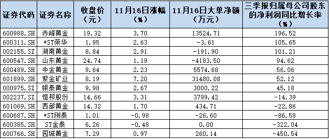 持續(xù)撤離的資金也終于“返身”入場?!蹲C券日報(bào)》記者根據(jù)同花順數(shù)據(jù)統(tǒng)計(jì)發(fā)現(xiàn),11月16日,黃金板塊結(jié)束連續(xù)5個(gè)交易日凈流出態(tài)勢,吸金逾5億元。具體來看,板塊內(nèi)7只黃金股獲大單資金青睞,紫金礦業(yè)、赤峰黃金等兩只個(gè)股大單資金凈流入超1億元,分別為31480.08萬元、13524.71萬元,其他呈現(xiàn)大單資金凈流入的個(gè)股還有,中金黃金、恒邦股份、銀泰黃金、西部黃金、園城黃金。這7只個(gè)股大單資金凈流入達(dá)到5.81億元。