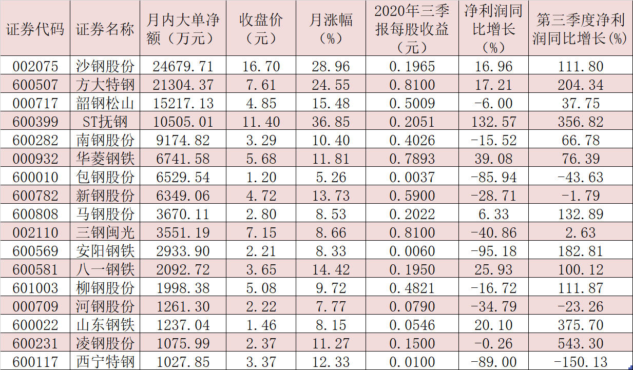 表:11月份以來(lái)獲超1000萬(wàn)元大單資金搶籌的鋼鐵股一覽