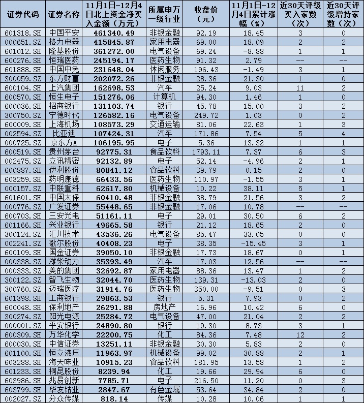表:11月份以來截至12月4日北上資金凈買入的41只個股情況: