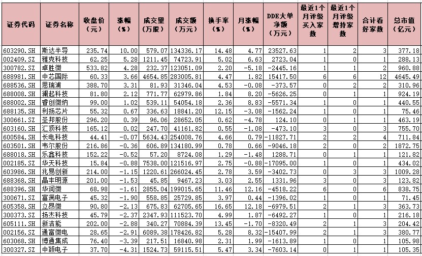 行業(yè)景氣的提升也促使機(jī)構(gòu)評級者看好相關(guān)股票,從最近一個月的機(jī)構(gòu)評級中來看,有24只個股獲機(jī)構(gòu)給予“買入“或“增持”等看好評級,其中,中芯國際得到看好評級家數(shù)最多,達(dá)12家,華潤微獲得6家機(jī)構(gòu)看好評級,長電科技獲得4家機(jī)構(gòu)看好評級。