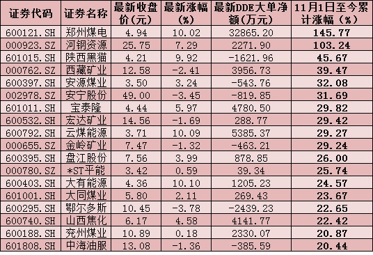 表:采掘行業(yè)中11月1日至今累計(jì)漲幅超20%的個(gè)股情況: