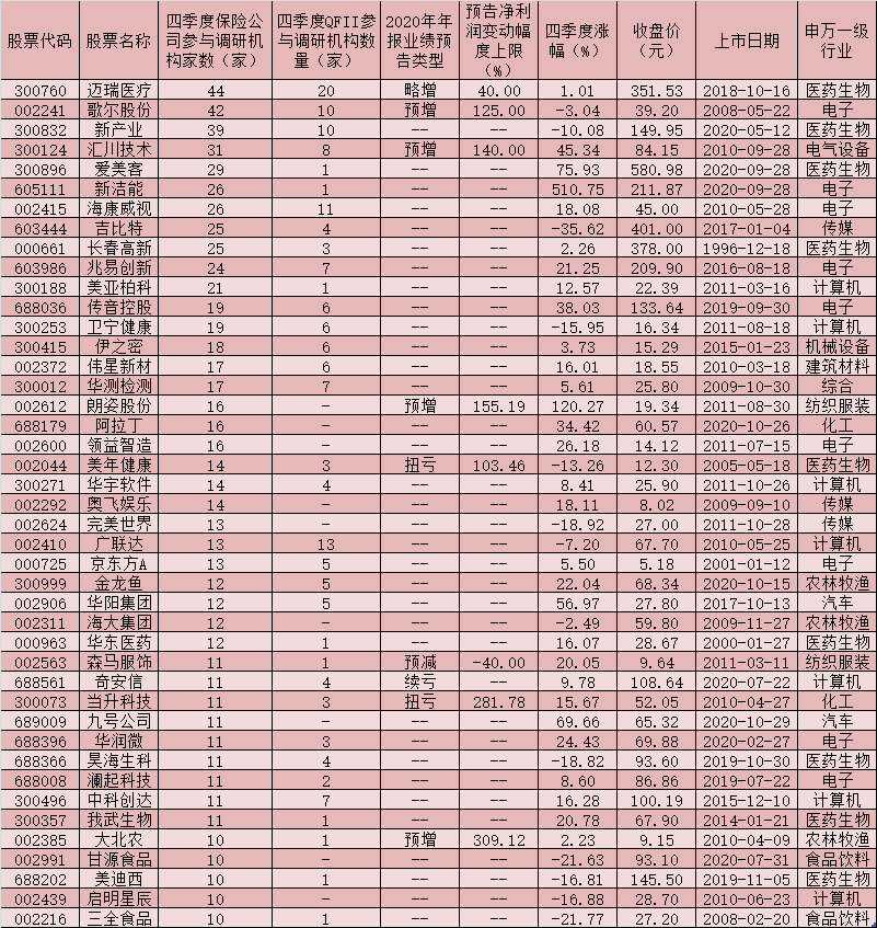 表:四季度獲10家及以上保險公司扎堆調(diào)研的個股