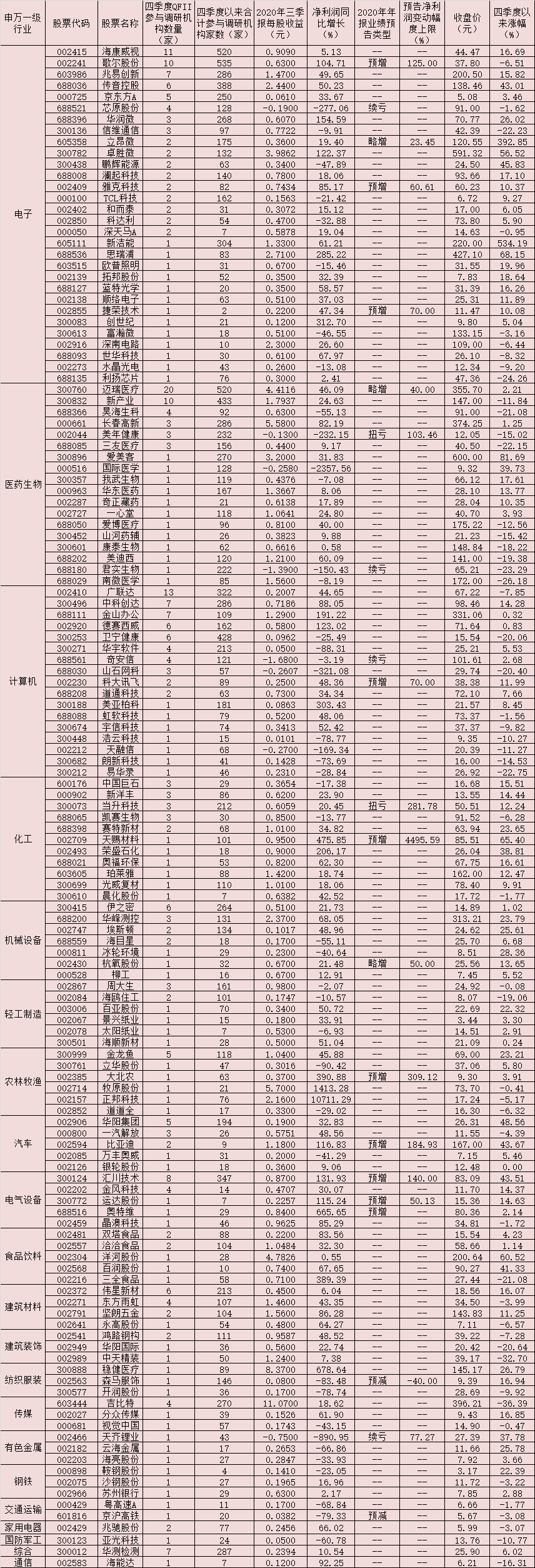 表:四季度獲QFII密集調研的個股一覽