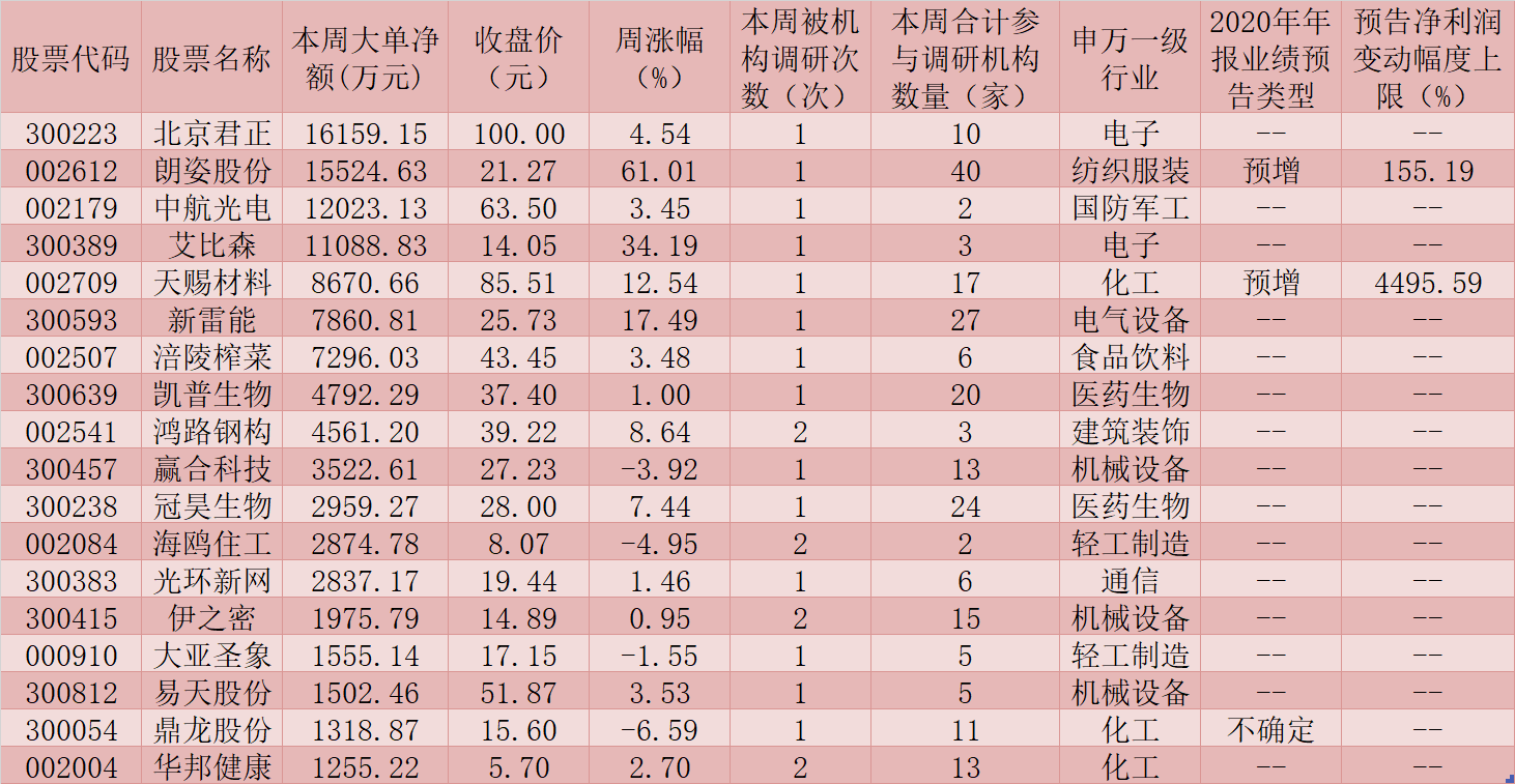 出色的年報業(yè)績預(yù)期向好或是本周機(jī)構(gòu)頻繁調(diào)研的重要動力。在上述本周被機(jī)構(gòu)調(diào)研的110家公司中,截至12月13日,已有14家公司率先披露了2020年年報業(yè)績預(yù)告,業(yè)績預(yù)告公司共有11家,占比近八成。天賜材料、樂歌股份、雙星新材、比亞迪、朗姿股份等5家公司均預(yù)計2020年全年凈利潤同比翻番;地鐵設(shè)計、勁嘉股份、中胤時尚等3家公司2020年全年凈利潤也均有望繼續(xù)增長;夢網(wǎng)集團(tuán)、藍(lán)黛科技、*ST海陸等3家公司2020年全年業(yè)績也均有望扭虧為盈。
