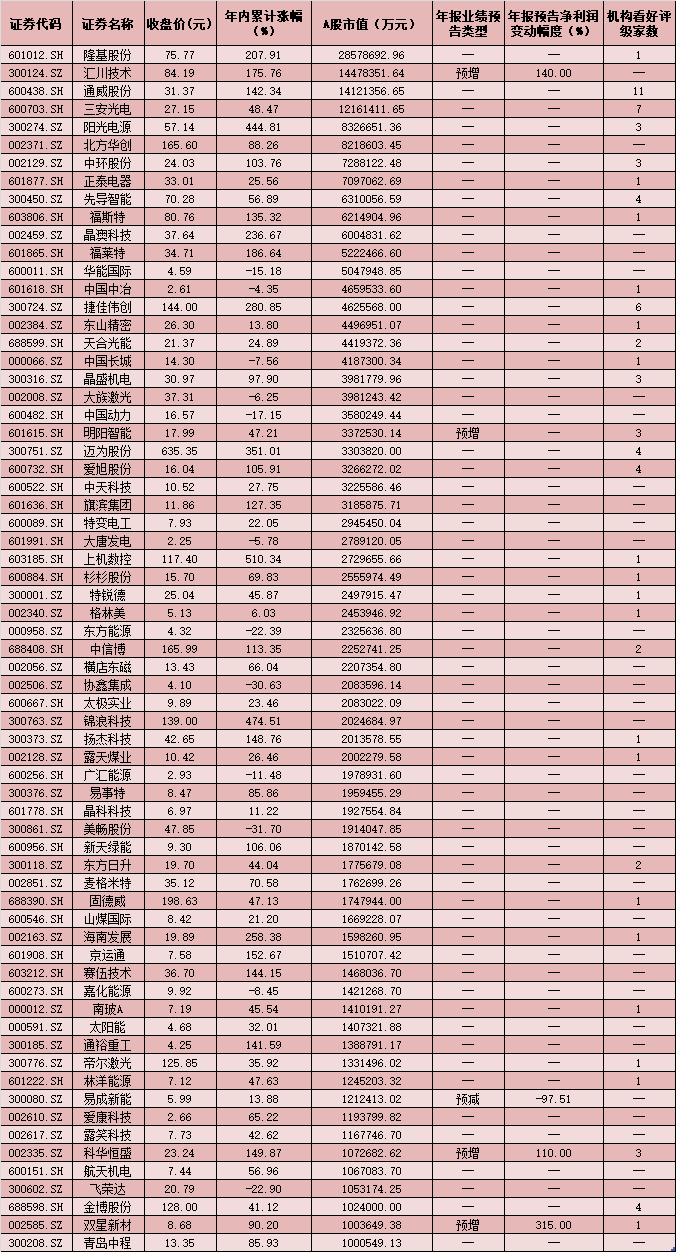 從總市值來看,經(jīng)過持續(xù)上漲后,截至12月14日收盤,67只光伏概念股最新總市值超100億元,隆基股份、匯川技術(shù)、通威股份、三安光電等4只個(gè)股最新總市值更是超過1000億元,分別為2857.87億元、1447.84億元、1412.14億元、1216.14億元。