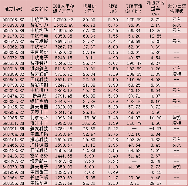 個股方面,行業(yè)78只交易中的個股有73只上漲,占比95.59%,其中,航發(fā)控制漲停報收,此外,尚有包括中航沈飛(8.16%)、鋼研高納(8.09%)、新光光電(7.64%)等在內(nèi)的13只個股漲幅超5%。