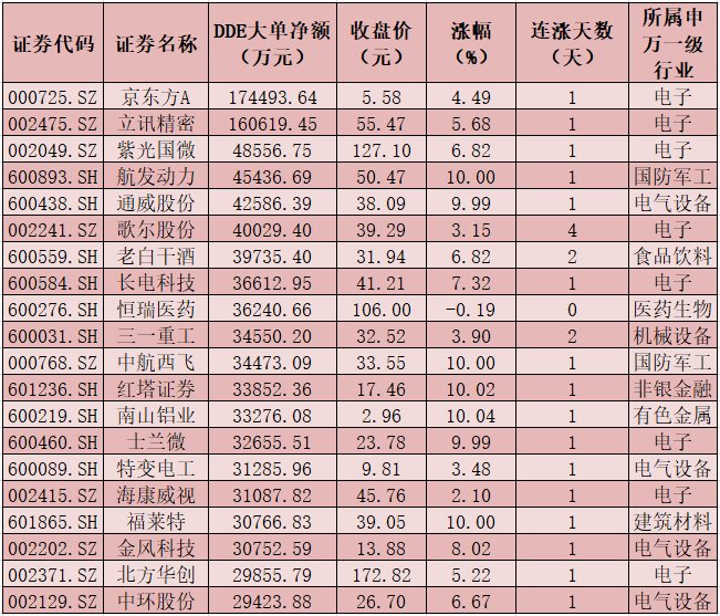 一、周三(12月23日)DDE大單資金凈買(mǎi)入TOP20