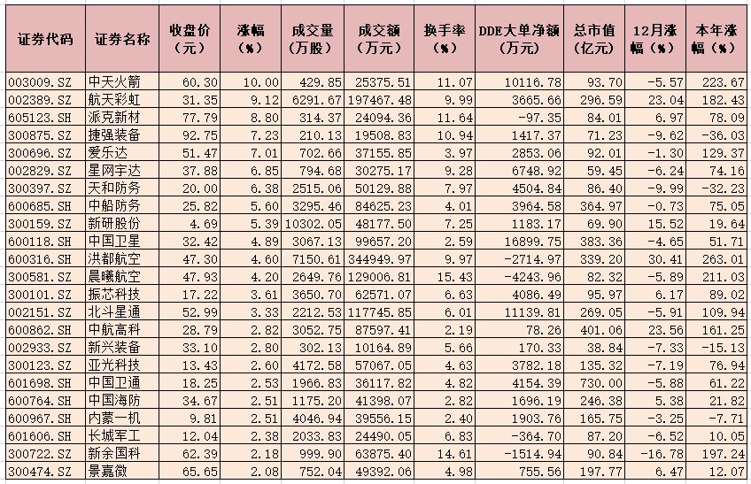 表:12月24日國防軍工行業(yè)漲幅超2%個股一覽