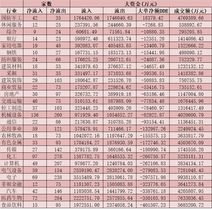 從資金層面看,今日A股大單資金整體凈流出379.51億元,其中,有1041只個股凈流入,3021只個股凈流出。從申萬一級的28個行業(yè)來看,僅國防軍工行業(yè)呈現(xiàn)大單資金凈流入態(tài)勢,大單資金凈流入合計達1.84億元。而在大單資金撤離的領域中,食品飲料、醫(yī)藥生物、汽車、非銀金融等四行業(yè)資金凈流出均超30億元。