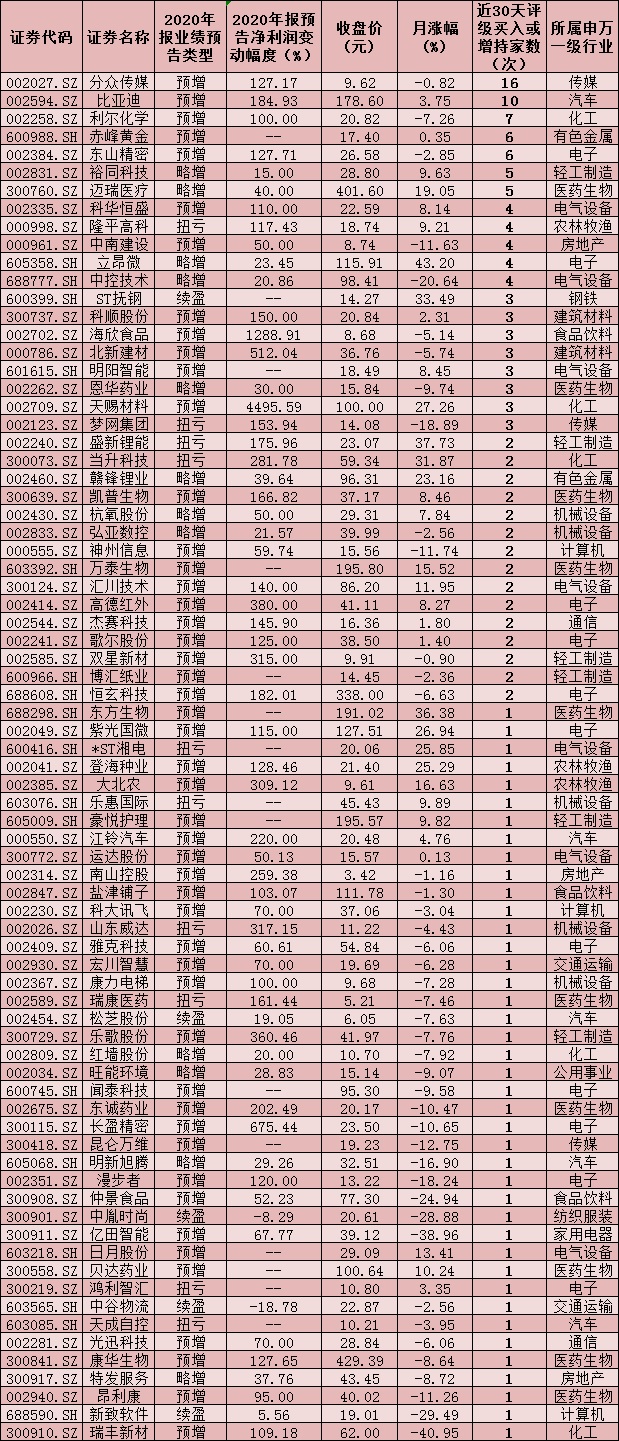 表:機構(gòu)近30日內(nèi)給予“買入”或“增持”以上評級的年報預(yù)喜公司情況:
