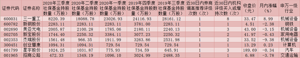 表:近30日內(nèi)獲券商調(diào)高推薦評級且被社保連續(xù)五個季度持倉的個股