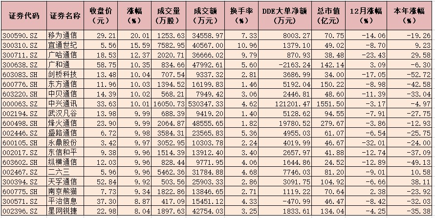 表:12月29日通信行業(yè)漲幅超8%個(gè)股一覽