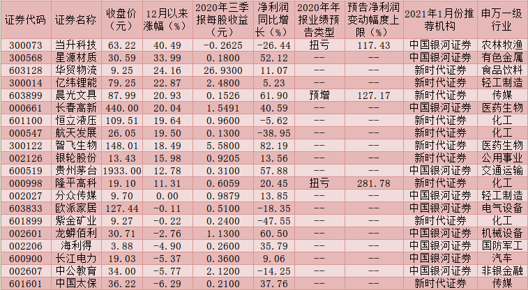 新年新氣象,《證券日?qǐng)?bào)》研究中心實(shí)時(shí)梳理券商2021年1月份金股組合,供參考。記者根據(jù)同花順數(shù)據(jù)統(tǒng)計(jì)后發(fā)現(xiàn),截至12月30日收盤(pán),中國(guó)銀河證券、新時(shí)代證券兩家券商共推出2021年1月份金股20只,涉及18個(gè)申萬(wàn)一級(jí)行業(yè)。