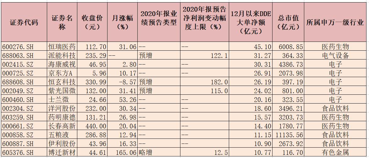 表:12月份以來(lái)大單資金凈流入超10億元個(gè)股一覽