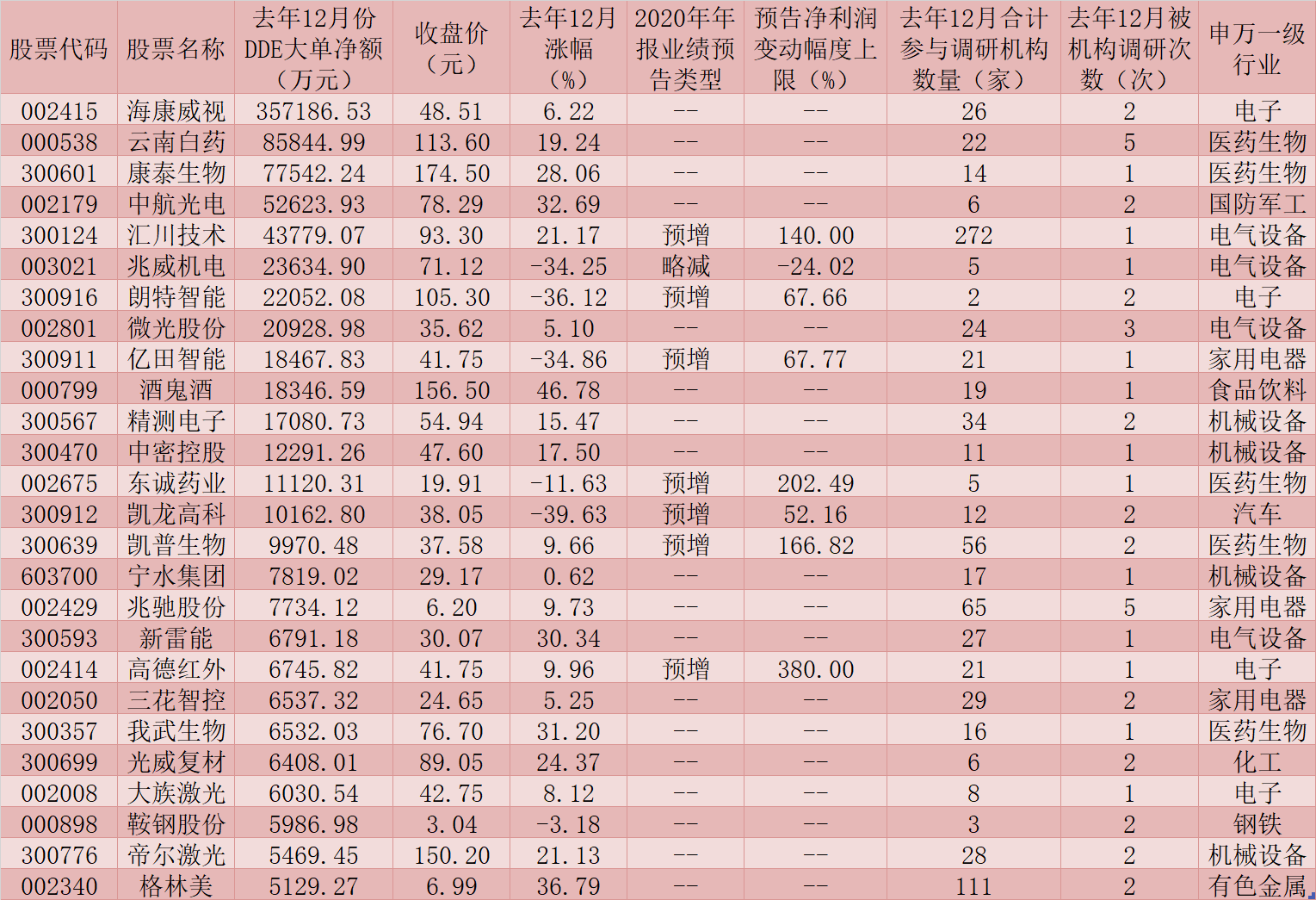 表:去年12月份獲超5000萬元以上大單資金布局的機(jī)構(gòu)調(diào)研股