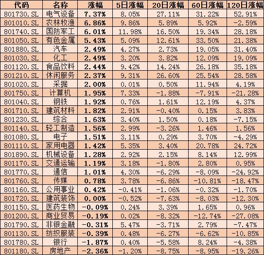 從行業(yè)來看,申萬一級28個行業(yè)多數(shù)飄紅。其中,電氣設(shè)備板塊表現(xiàn)強(qiáng)勢,漲幅達(dá)7.37%;緊隨其后的是農(nóng)林牧漁、國防軍工和有色金屬等三行業(yè),漲幅均超5%,分別為6.86%、6.01%和5.43%;房地產(chǎn)、銀行等兩行業(yè)跌幅居前均超1%。