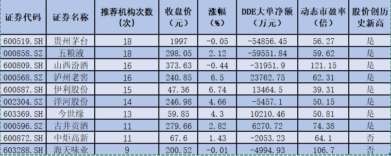 進一步梳理發(fā)現(xiàn),食品飲料行業(yè)獲得推薦次數(shù)最多的前十大“金股”分別為貴州茅臺、五糧液、山西汾酒、瀘州老窖、伊利股份、洋河股份、今世緣、古井貢酒、中炬高新、海天味業(yè)。