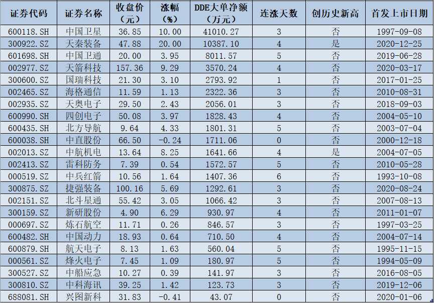 表:1月5日大單資金凈流入的軍工股一覽