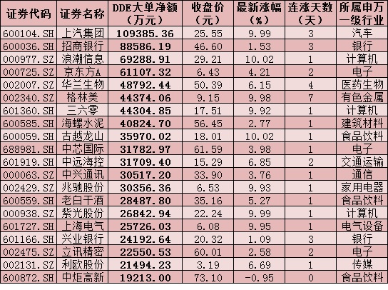 一、周五(1月8日)DDE大單資金凈買入TOP20