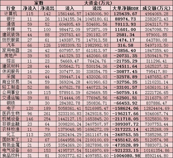 從資金層面看,今日A股大單資金整體凈流出447.36億元,其中,有1360只個股呈現(xiàn)資金凈流入,2722只個股呈現(xiàn)資金凈流出。從申萬一級的28個行業(yè)來看,有7個行業(yè)呈現(xiàn)大單資金凈流入態(tài)勢,其中,計算機、銀行、通信等三行業(yè)資金凈流入均超7億元,分別為12.54億元、8.9億元和7.01億元,合計達28.45億元,緊隨其后的是傳媒、建筑裝飾、紡織服裝、汽車等四行業(yè)。另外,食品飲料、電氣設(shè)備、有色金屬、國防軍工等行業(yè)資金凈流出均超40億元。