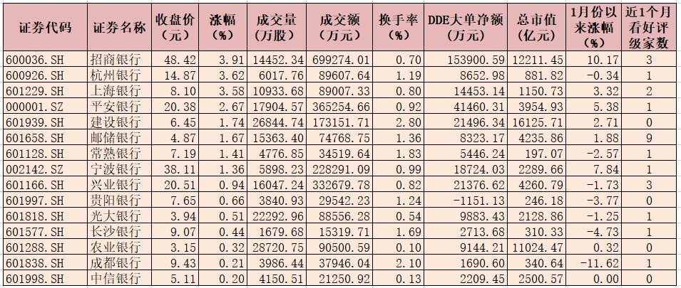 1月11日,大盤指數(shù)全天震蕩下行,截至收盤,上證指數(shù)跌1.08%,銀行業(yè)指數(shù)全天表現(xiàn)強(qiáng)勢,逆市收漲1.15%,行業(yè)內(nèi)有15只個股收漲,占比超四成。具體個股表現(xiàn)來看,招商銀行領(lǐng)漲,漲3.91%,杭州銀行和上海銀行漲幅均超3%,分別為3.62%和3.58%。值得一提的是,招商銀行今日股價最高達(dá)49.17元/股,創(chuàng)歷史新高,該股收盤報48.42元/股,最新總市值為12211.45億元。