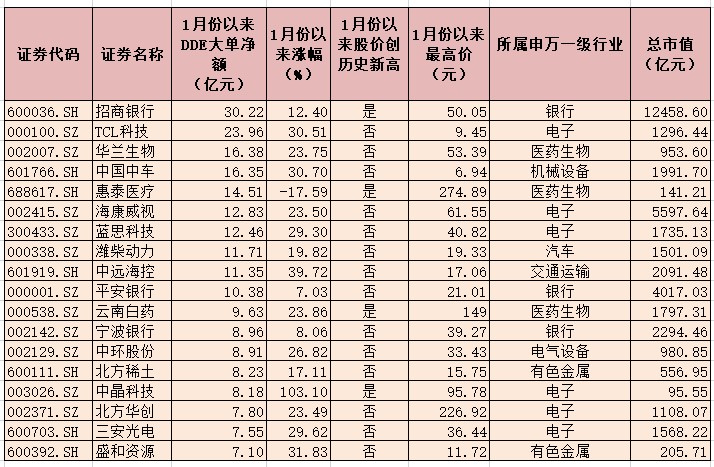 表:1月份以來大單資金凈流入超7億元個股一覽