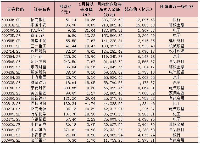 表:1月份以來北上資金期間凈買入的個(gè)股一覽