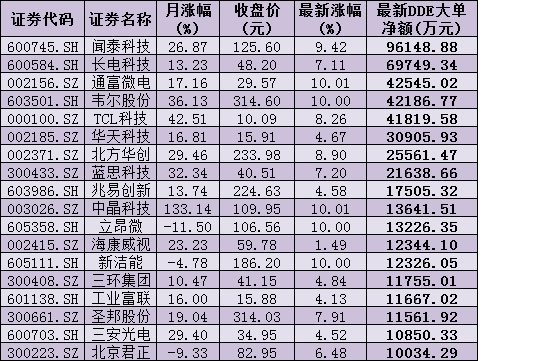 出色的表現(xiàn)無疑受到資金的追捧。《證券日報》記者根據(jù)同花順統(tǒng)計發(fā)現(xiàn),周一,電子行業(yè)整體資金凈流入達55.92億元,其中,聞泰科技、長電科技、通富微電、韋爾股份、TCL科技等5只個股,資金凈流入均超4億元,分別為9.61億元、6.97億元、4.25億元、4.22億元、4.18億元。