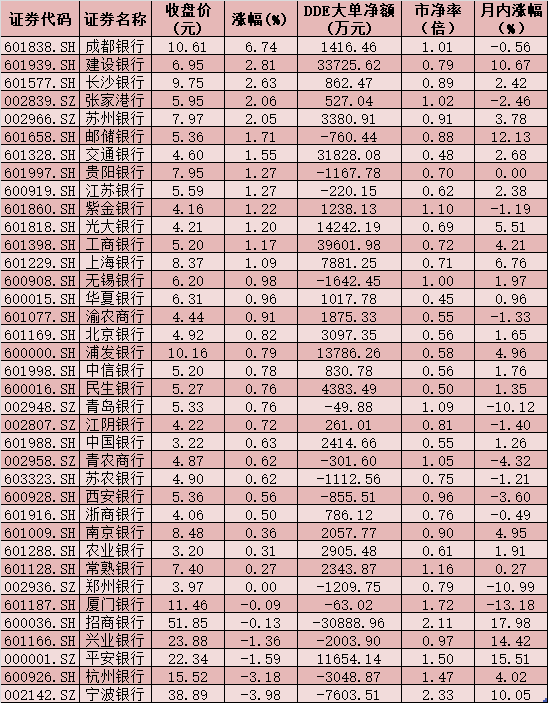 可以看到,今年以來,共有24只銀行股實現(xiàn)上漲,占行業(yè)成份股家數(shù)比例超過六成,其中,招商銀行、平安銀行、興業(yè)銀行、郵儲銀行、建設銀行、寧波銀行等6只個股期間累計漲幅均在10%以上。