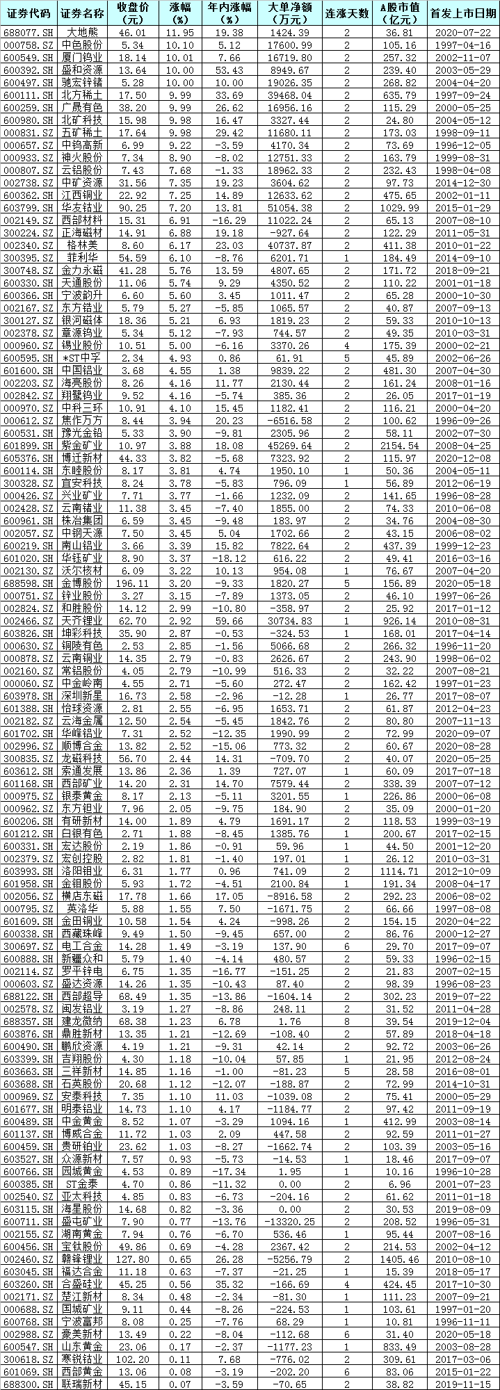 表:1月21日實(shí)現(xiàn)上漲的有色金屬股一覽