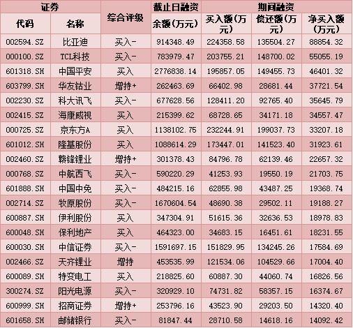 七、1月21日融資凈買入股TOP20