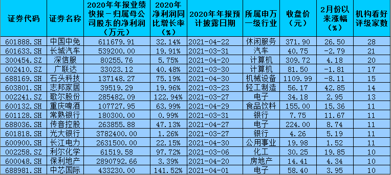 的確,自A股進入年報披露期之后,核心資產(chǎn)業(yè)績表現(xiàn)對股價的傳導在市場中變得極為敏感,機構的選股壓力明顯增大。在這一背景下,上述171家2020年凈利潤實現(xiàn)同比增長的公司中,仍有86家公司最近1個月內(nèi)被機構給予“買入”或“增持”等看好評級,其中,15家公司機構看好評級家數(shù)在10家以上,中國中免、長城汽車、深信服等3只個股機構看好評級家數(shù)均在20家及以上,分別為28家、21家、20家。