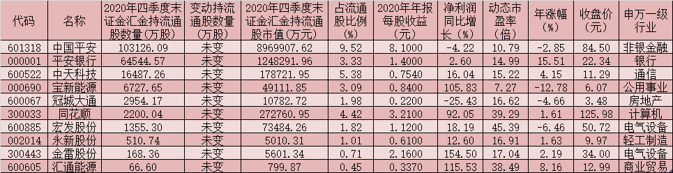 表:已披露年報獲得證金匯金持倉的股票一覽
