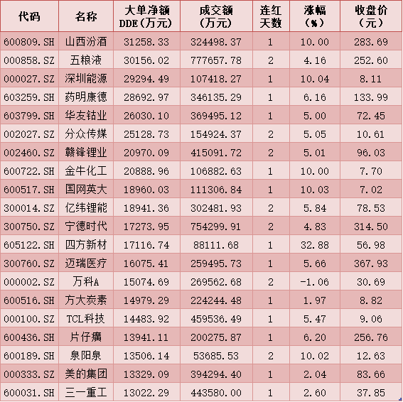 一、周三(3月10日)DDE大單資金凈買入TOP20