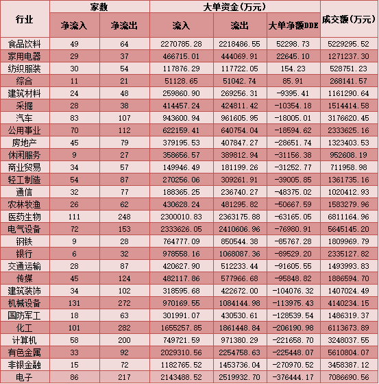 二、周三(3月10日)申萬一級行業(yè)大單資金流向