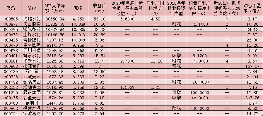 表:3月11日獲超千萬元以上大單資金追捧的水泥股