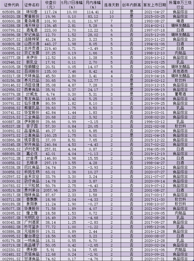 表:股價(jià)實(shí)現(xiàn)連漲的食品飲料股一覽