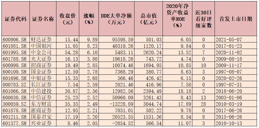 表:5月24日漲幅超2%的券商股一覽