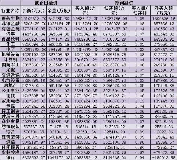 另外,化工、電子、機(jī)械設(shè)備等行業(yè)期間融資凈買入額也均在30億元以上。僅有銀行、農(nóng)林牧漁、休閑服務(wù)、通信、建筑裝飾、綜合等六行業(yè)被融資客減持。