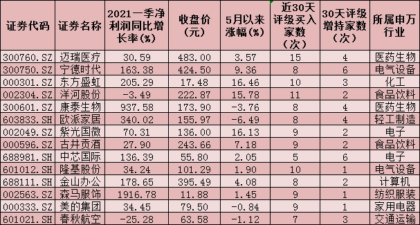 《證券日報》記者根據(jù)同花順統(tǒng)計發(fā)現(xiàn),近30日內(nèi),包括中金公司、申銀萬國、銀河證券、國泰君安、中信證券、招商證券等主流券商在內(nèi)的53家券商共推薦了1010只個股,其中,受到5次以上券商“相中”(含買入和增持評級)的個股有112只。值得關注的是,邁瑞醫(yī)療、寧德時代、東方盛虹、洋河股份、歐派家居、康泰生物、中芯國際、古井貢酒、紫光國微、隆基股份、春秋航空、金山辦公、美的集團、森馬服飾等14只個股,期間均獲得10次及以上,機構給予“買入”或“增持”等看好評級。